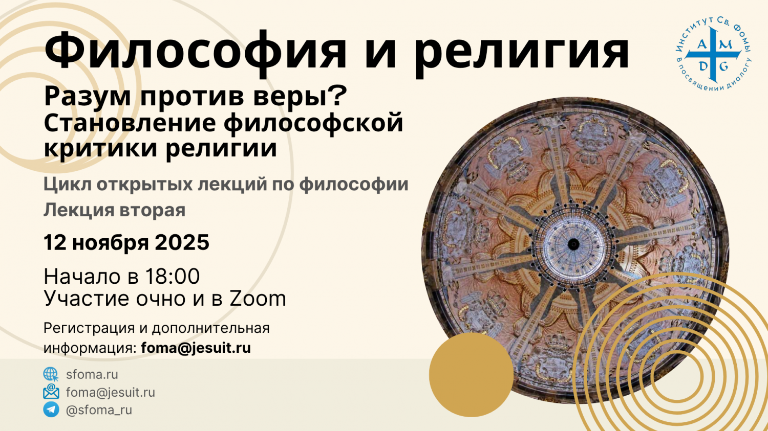12 ноября Институт Св. Фомы приглашает на вторую лекцию цикла «Диалоги о смысле», посвященную истории философской критики религии — от первых попыток осмыслить веру разумом до современных поисков диалога между рациональным и духовным.
