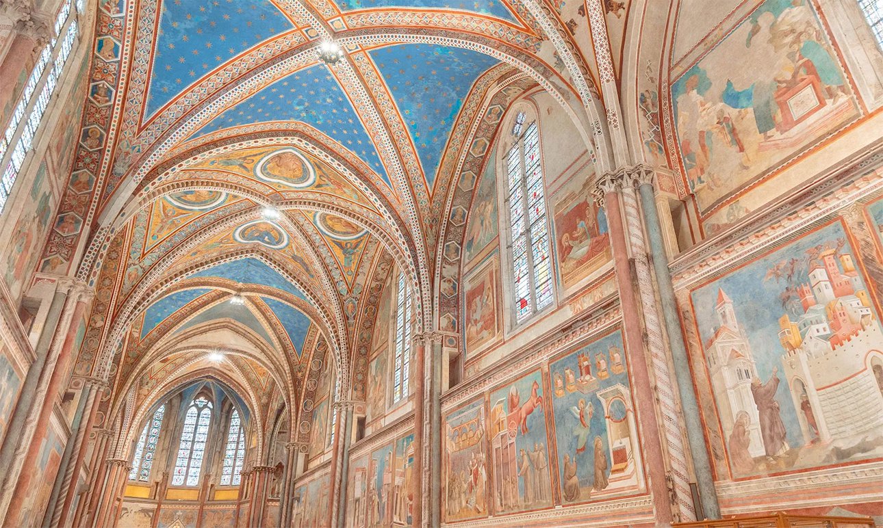 Базилика Святого Франциска в Ассизи, внесенная в список всемирного наследия ЮНЕСКО, сильно пострадала в 1997 году в результате двух мощных толчков магнитудой 5,7 и 6,0, унесших жизни четырех человек и повредивших цикл фресок Джотто со сценами из жизни святого Франциска. В числе наиболее пострадавших произведений была и фреска Чимабуэ, украшавшая сводчатый потолок. На каждой из четырех изогнутых треугольных секций потолка располагалось изображение одного из евангелистов на фоне архитектурных пейзажей с подписями «Азия», «Греция», «Иудея» и «Италия» (в устаревшем написании Ytalia).