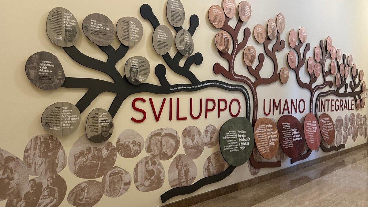 Корни «дерева» символизируют четыре ведомства, которые стали фундаментом Департамента, а ветви — движение к будущему, где каждый человек может жить с достоинством. На стволах «древа» увековечены имена префектов, которые руководили и вдохновляли работу Папских советов, а листья отражают ключевые моменты и инициативы Департамента. Мозаика лиц и судеб показывает человечество, которому служит это куриальное ведомство ведомство — путь Церкви, идущей навстречу каждому с особым вниманием к наиболее уязвимым.