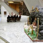 Мы видим, как Младенец Иисус как будто «благословляет всех и вся». Ремесленники кажутся оторванными от центрального события Рождества, но на самом деле это не так: каждый участвует в этом событии, находясь на своем месте и делая то, что должен делать, выполняя свою работу. Папа провел параллель с нашей работой в Ватикане: у каждого свое задание, и все мы воздаем хвалу Богу, выполняя его с усердием.