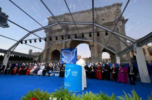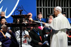 Святейший Отец напомнил о традиции, заложенной святым Иоанном Павлом II в Ассизи, где более 30 лет назад религиозные лидеры всего мира впервые собрались вместе, чтобы молиться не друг против друга, а рядом друг с другом. Сегодня это наследие сохраняется в духе диалога и братства между верующими, и оно закреплено в декларации Nostra aetate, провозгласившей необходимость обновления отношений Церкви с другими религиями и подтверждающей, что все народы образуют единую человеческую семью.