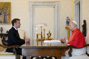 После беседы с Папой Макрон отправился в Госсекретариат, где прошли переговоры с госсекретарем кардиналом Паролином и секретарем по связям с государствами и международными организациями монсеньором Полом Ричардом Галлахером. Среди затронутых тем, согласно сообщению Зала печати Ватикана, фигурировали добрые отношения между Апостольским Престолом и Францией, международная обстановка и текущие конфликты в мире. Стороны выразили надежду, что мирное сосуществование будет восстановлено посредством диалога и переговоров.