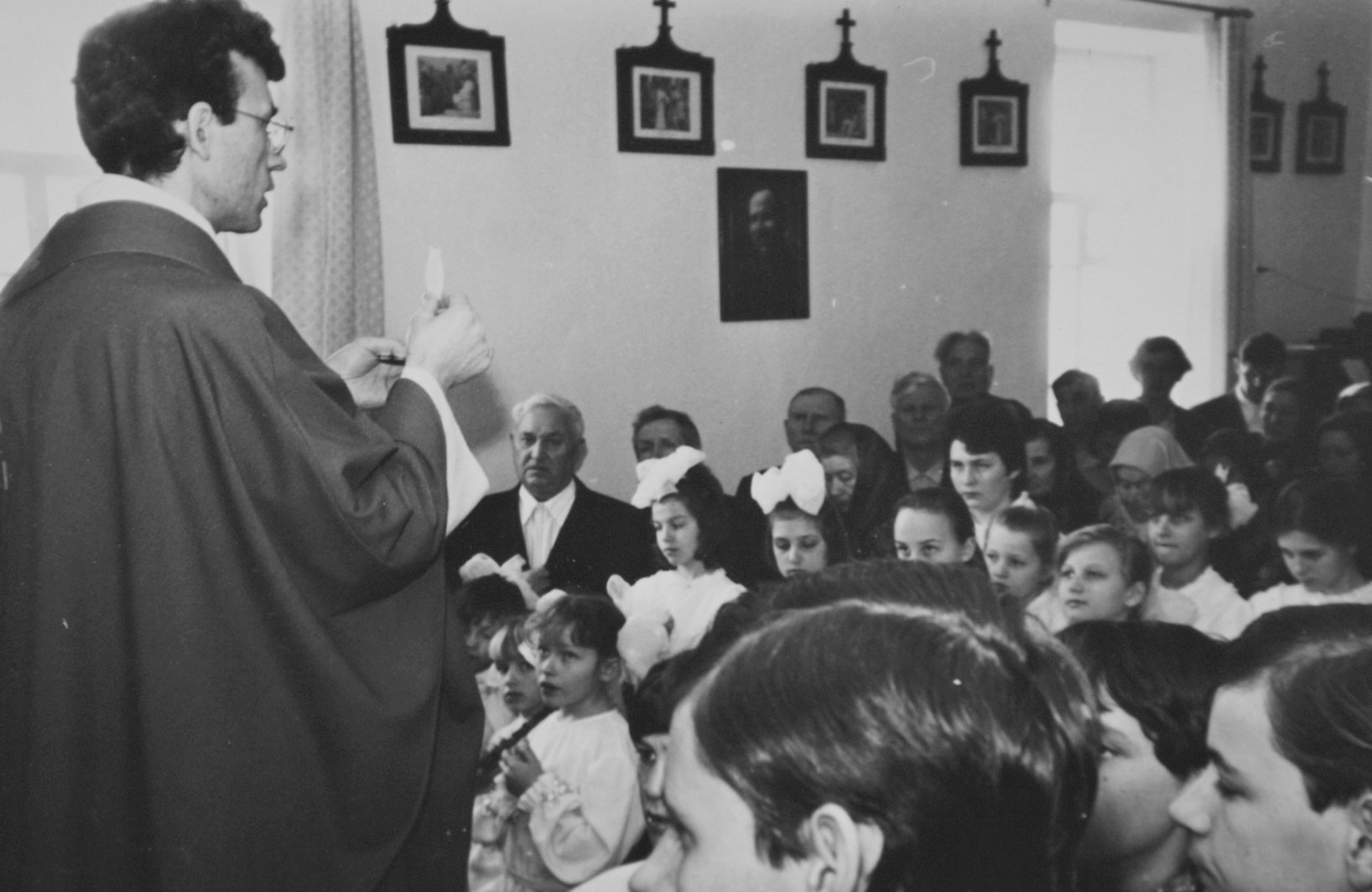 Я был рукоположен в священники в 1984 году. Я учился в семинарии в Каунасе и там рукоположен. И когда в Караганде я совершал примицию – первую торжественную Мессу в своём родном приходе, после Мессы ко мне подходят две молодые девушки – мои родные сёстры – Лена и Роза и старшая женщина, очень благочестивая, мы её хорошо знали, – Анна Мерковская, и они сообщили, что на следующий день едут в Маркс, в Поволжье. Они все были члены Конгрегации Сестёр Евхаристок. Анна уже полный член, Лена и Роза – кандидатки, они были в Конгрегации только первые месяцы. И вот втроём они отправились в Маркс. Через три месяца я в первый раз в жизни навестил вот эту обетованную землю, о которой мы так много знали! Волга – это было такое сказочное слово, это был земной рай, где росли арбузы, яблоки валились с деревьев прямо на улицу; и было многое другое, чего у нас в Караганде не было. И вот я впервые навестил Маркс осенью 1984 года.