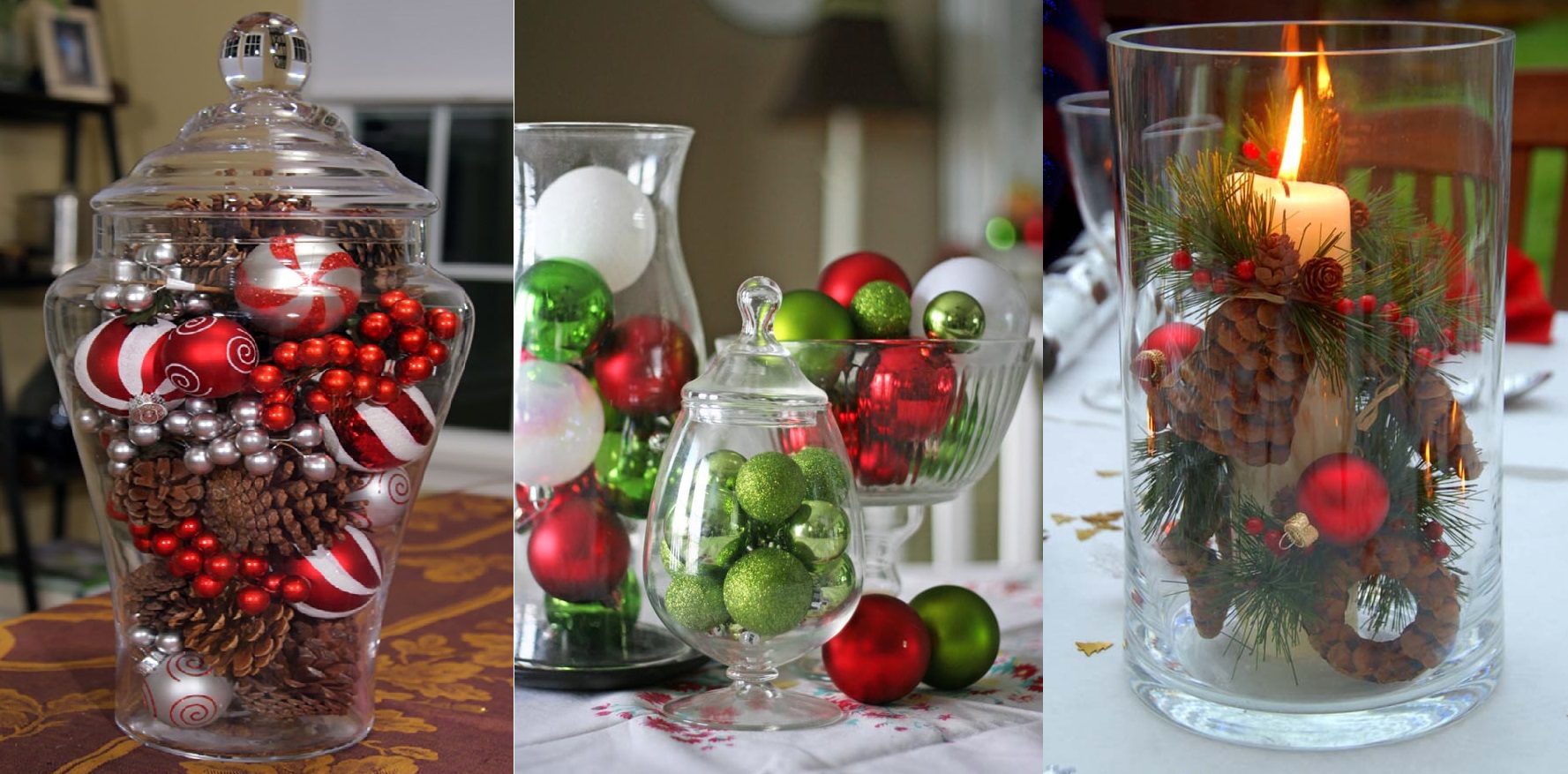 Для реализации этой эффектной композиции понадобятся любые прозрачные емкости (например, вазы для цветов или симпатичные банки), шарики разных размеров и свечи. Остальное — на ваше усмотрение. Наполняем емкость шарами разных размеров и цветов, ставим свечи — получается отличное украшение для центра стола, комода или подоконника. Такие стеклянные островки можно расставить по всему дому. Лучше всего смотрятся композиции в одной цветовой гамме.