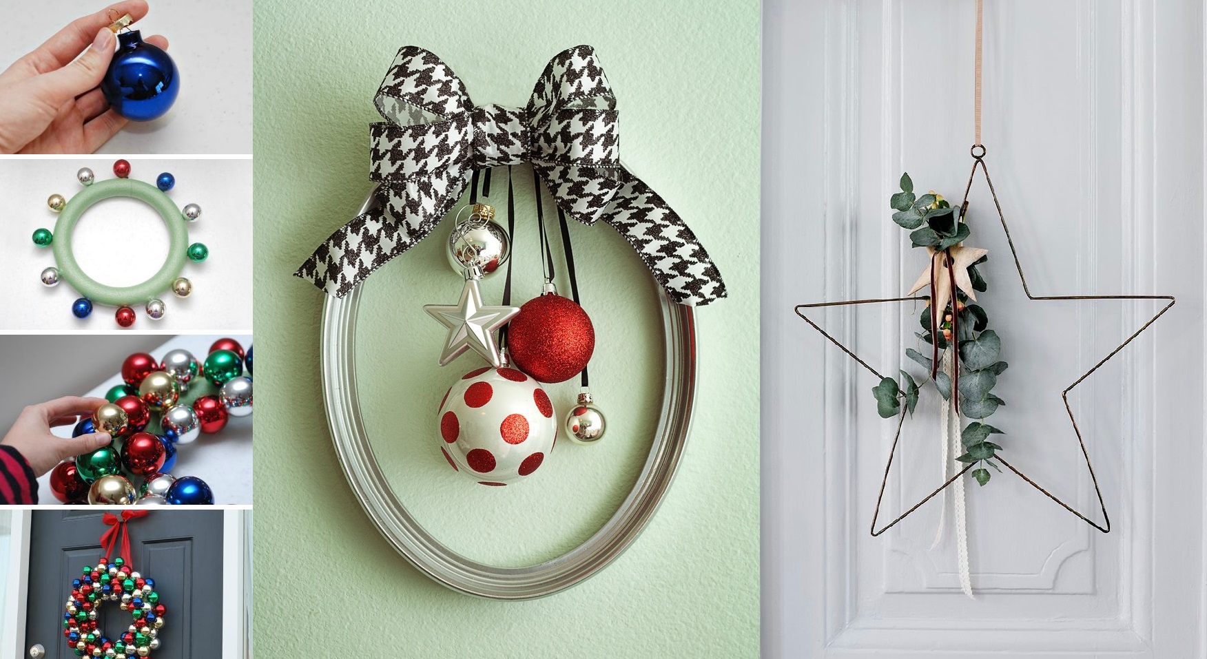 Двери проще всего декорировать гирляндами и мишурой, подвешенными по периметру. Очень празднично смотрятся венки — если нет времени на изготовление сложного венка из веток и ягод, то можно изготовить минималистский вариант. Основу из пенопласта можно приобрести в хозяйственном или флористическом магазине. Впрочем, подойдет даже старая вешалка из проволоки! С помощью клея украшаем ее шарами, лентами, ветками, шишками, буквами. Альтернатива — деревянные рамки для фотографий. Легкий венок можно прикрепить на дверь с помощью крючка на липкой ленте.