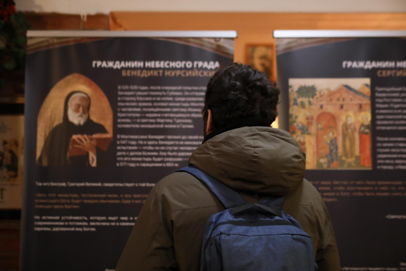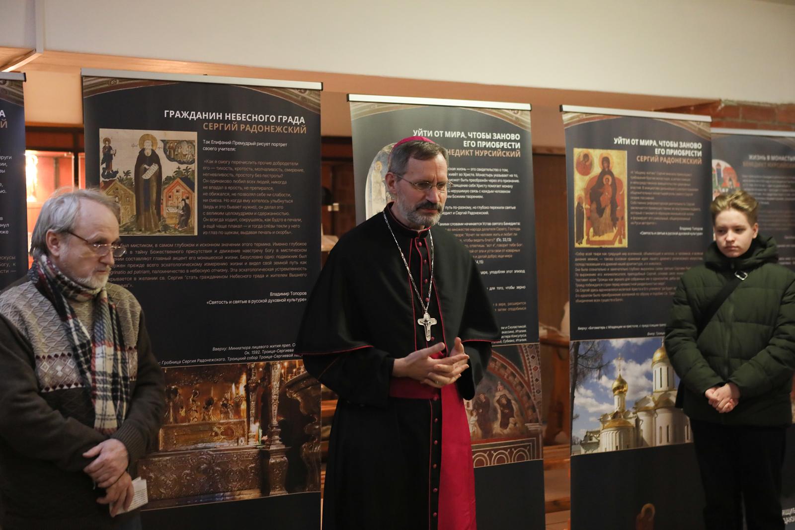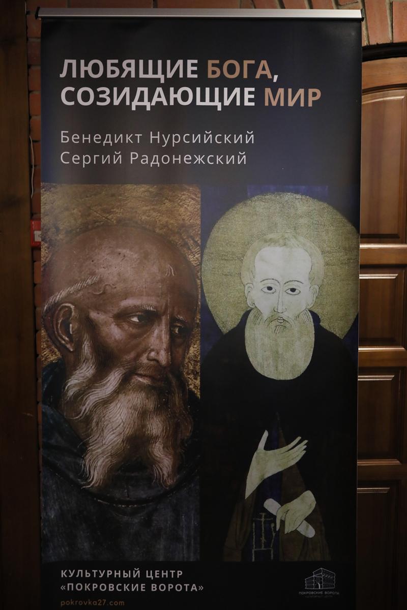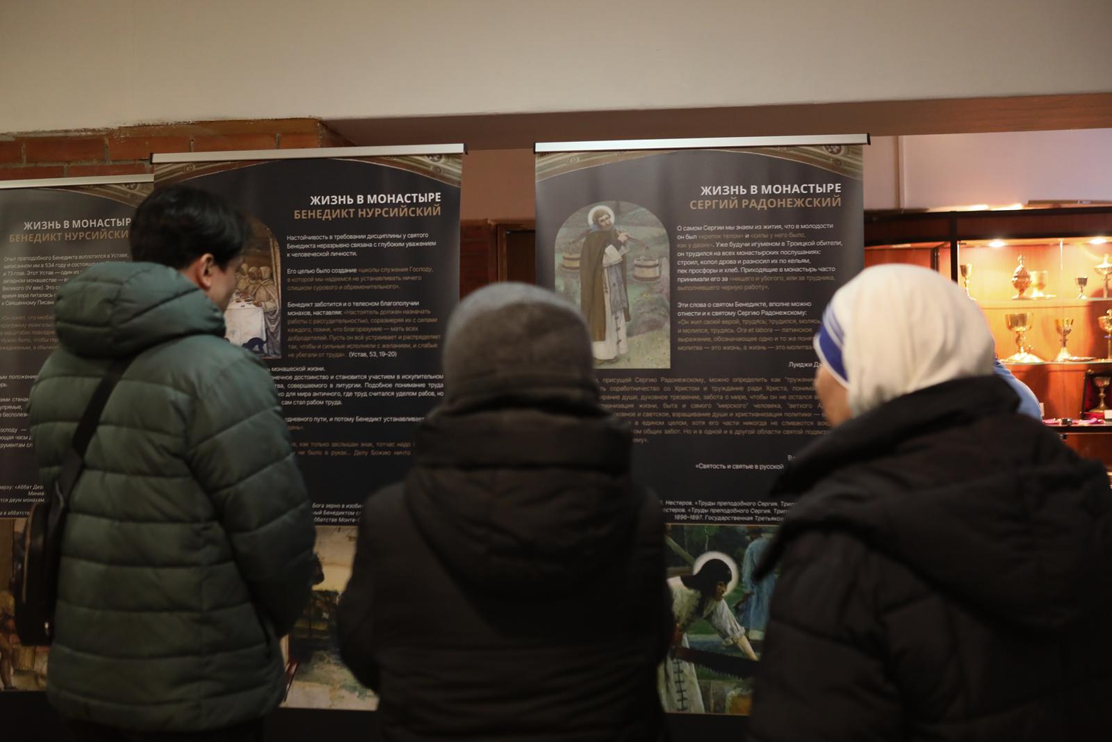 А затем все участники встречи были приглашены Культурным центром «Иниго» на открытие тематической выставки «Любящие Бога, созидающие мир», посвященной святым Бенедикту Нурсийскому и Сергию Радонежскому. Это та же самая выставка, которая осенью 2025 года проходила в Москве на территории Культурного центра «Покровские ворота» в рамках ежегодного христианского фестиваля «Место встречи». Её целью стал рассказ не только о жизни этих святых, но и о духовном, культурном и историческом контексте, в котором формировались их личности и их миссия.