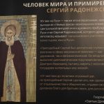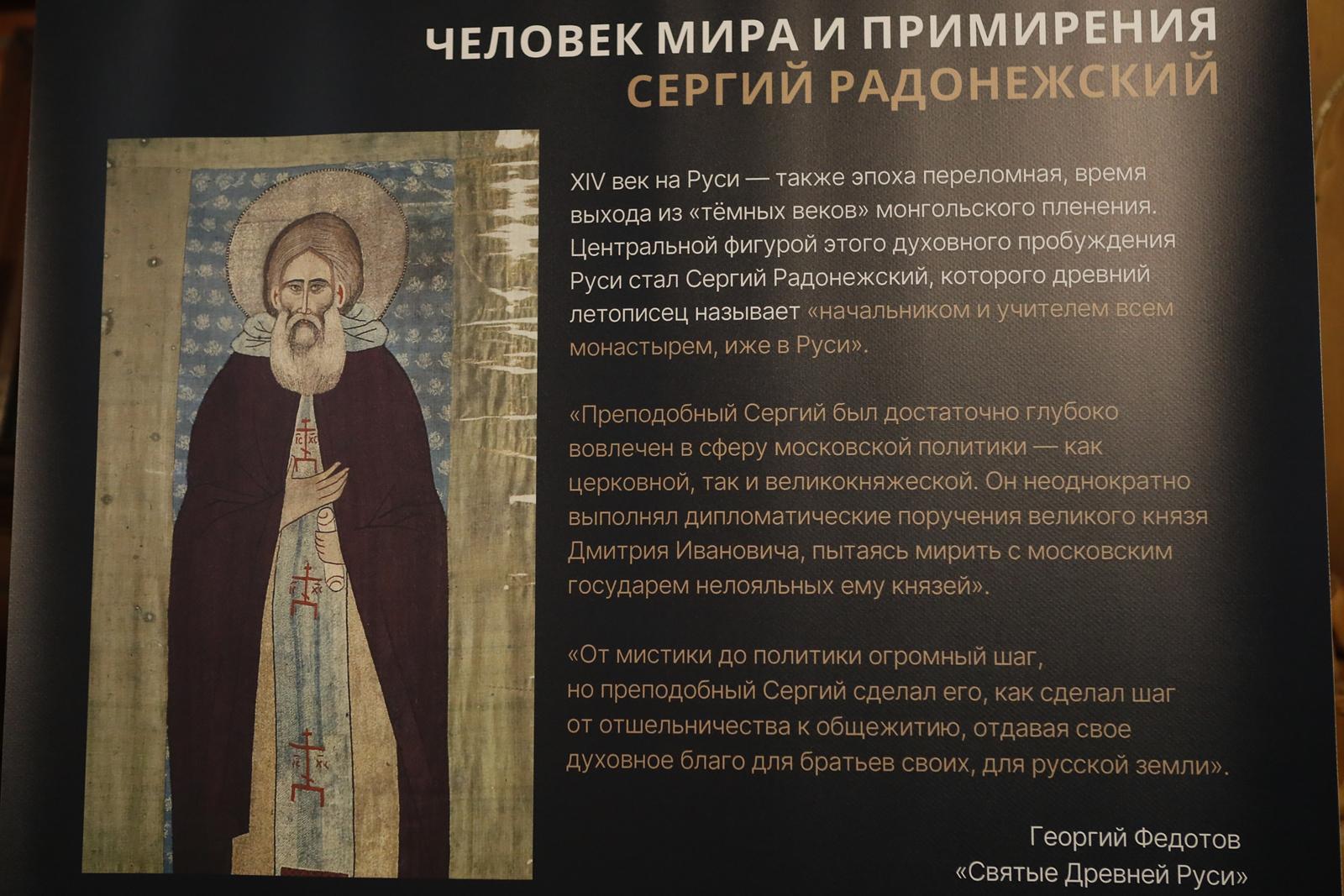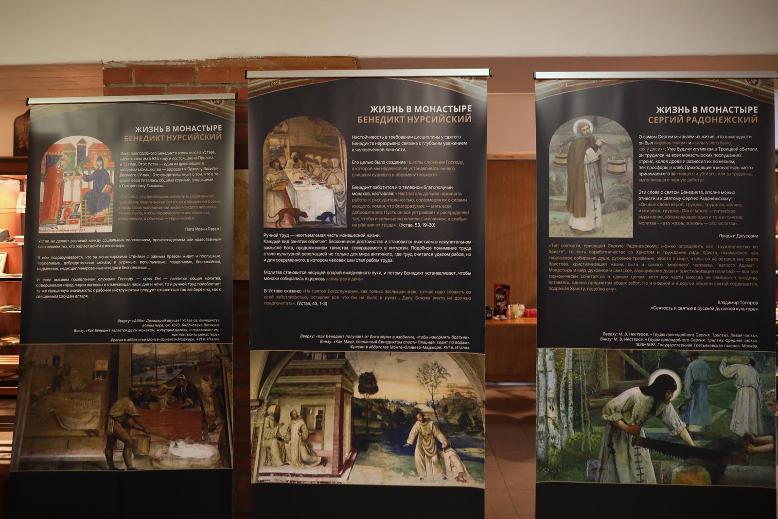 Экспозиция представляет собой полтора десятка стендов, каждый из которых раскрывает тематическую линию рассказа о святых так, чтобы их история воспринималась параллельно. «Любовь выше закона», «Гражданин небесного града», «Человек мира и примирения» – эти определения раскрывают суть духовного подвига двух преподобных, разделенных столетиями и расстояниями. Помимо иллюстраций, на планшетах есть фрагменты житий (о св. Бенедикте рассказывает св. Григорий Двоеслов в «Диалоге о чудесах Отцов Италийских», а о прп. Сергии – Епифаний Премудрый), а также высказывания Евгения Трубецкого, Георгия Федотова, о. Павла Флоренского, Владимира Топорова, о. Луиджи Джуссани и других, которые раскрывают похожий опыт обоих святых. Создатели экспозиции старались показать, «как миссия прп. Сергия Радонежского в определенном смысле продолжает и развивает духовное дело святого, объединяя людей вокруг идеи внутреннего мира, труда во имя Бога и любви как основы человеческого бытия».