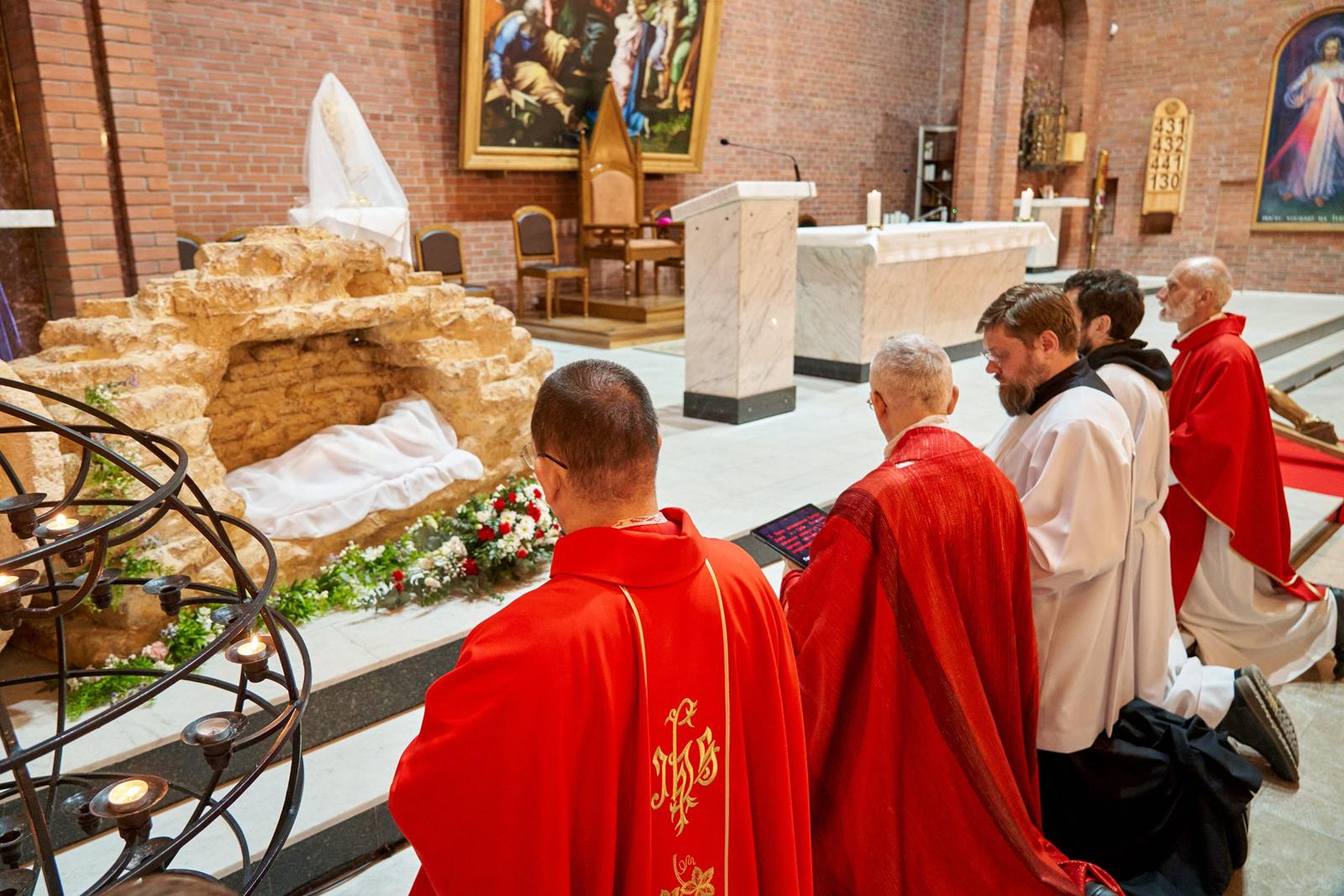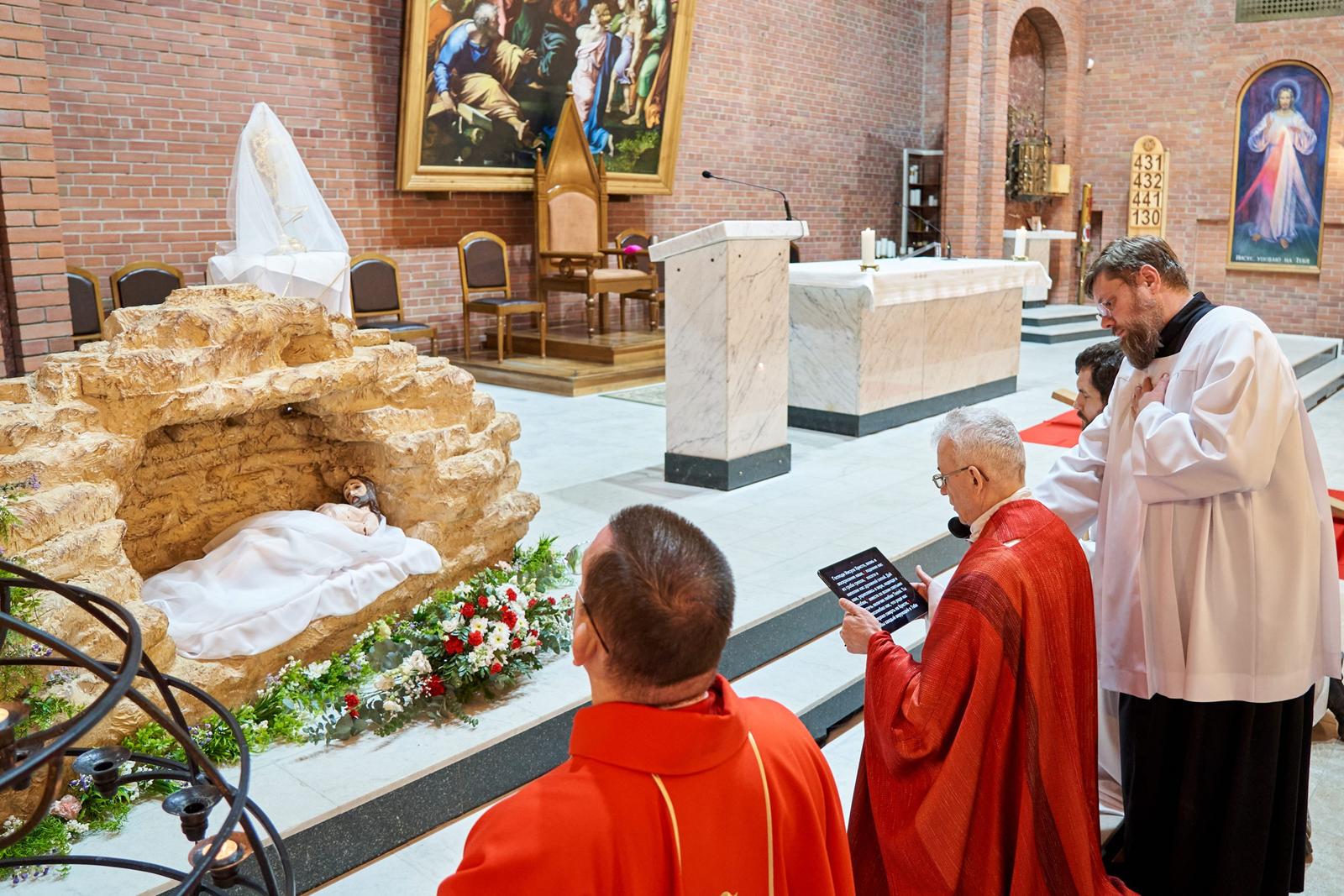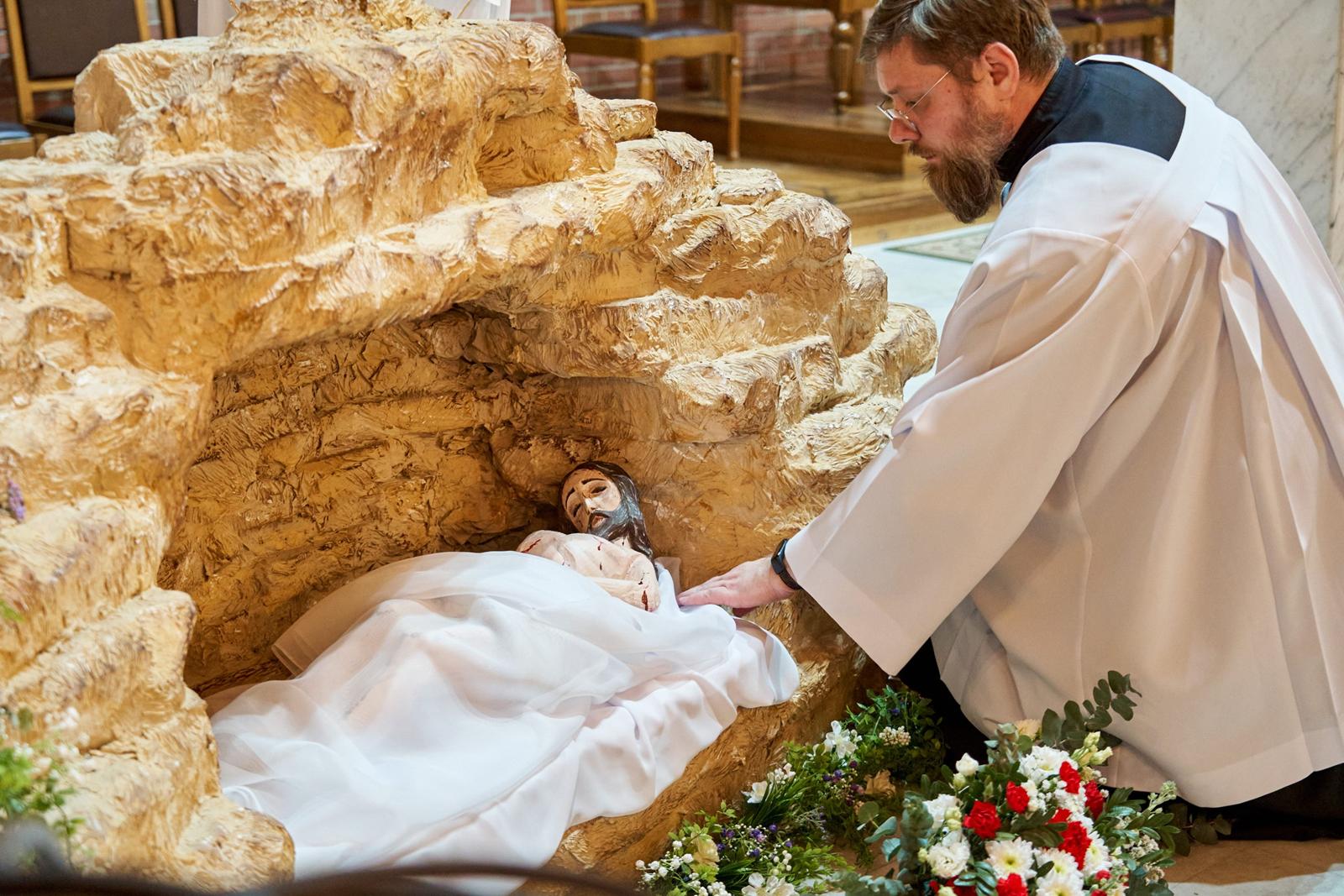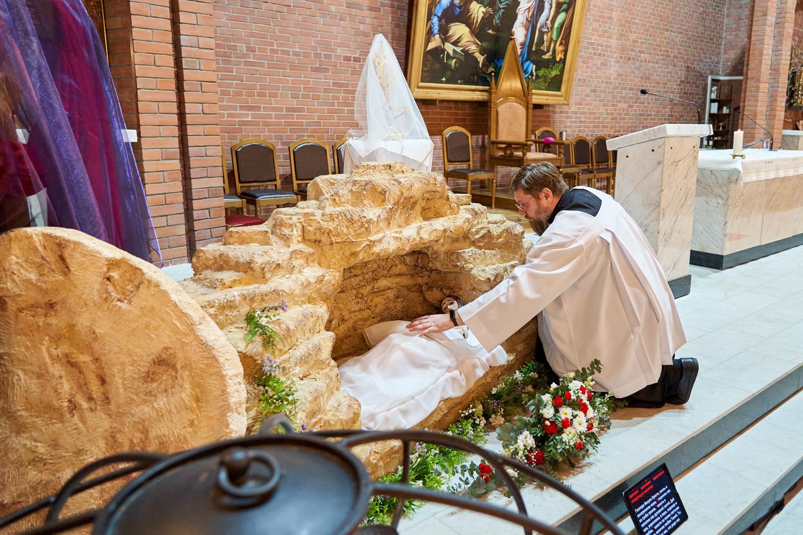Богослужение завершается открытием макета гробницы Иисуса Христа (аналог используемой в Православной Церкви плащаницы) и водружением вблизи него Святых Даров для поклонения.