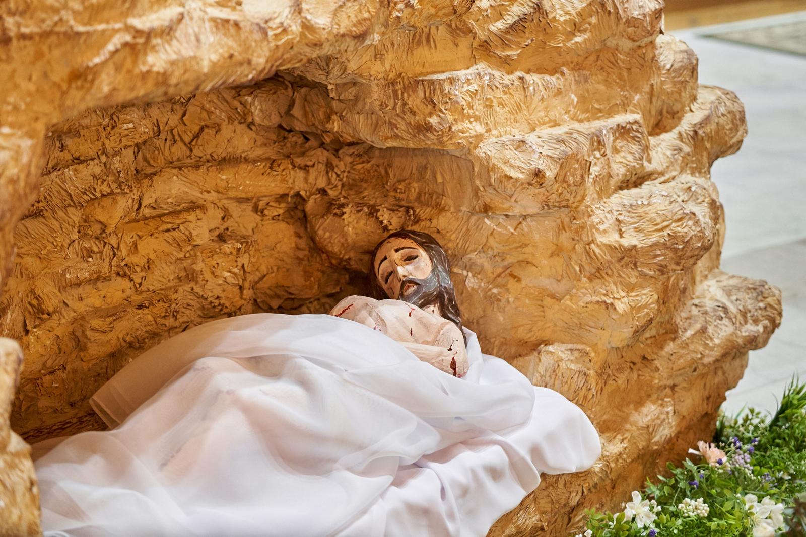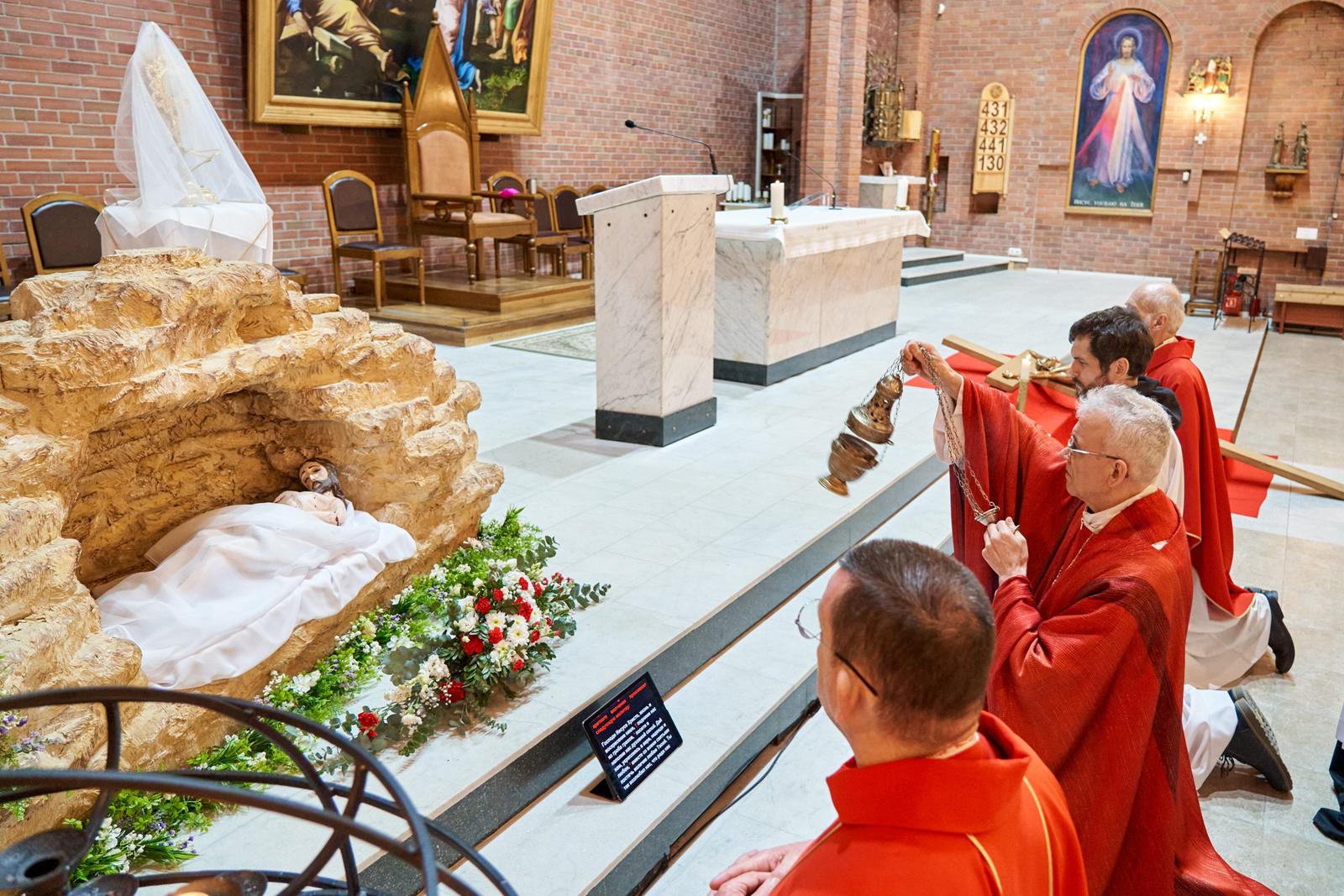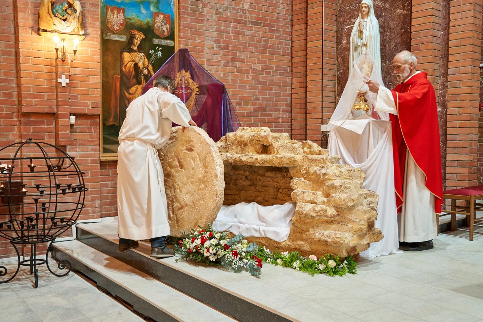 Богослужение завершается открытием макета гробницы Иисуса Христа (аналог используемой в Православной Церкви плащаницы) и водружением вблизи него Святых Даров для поклонения.