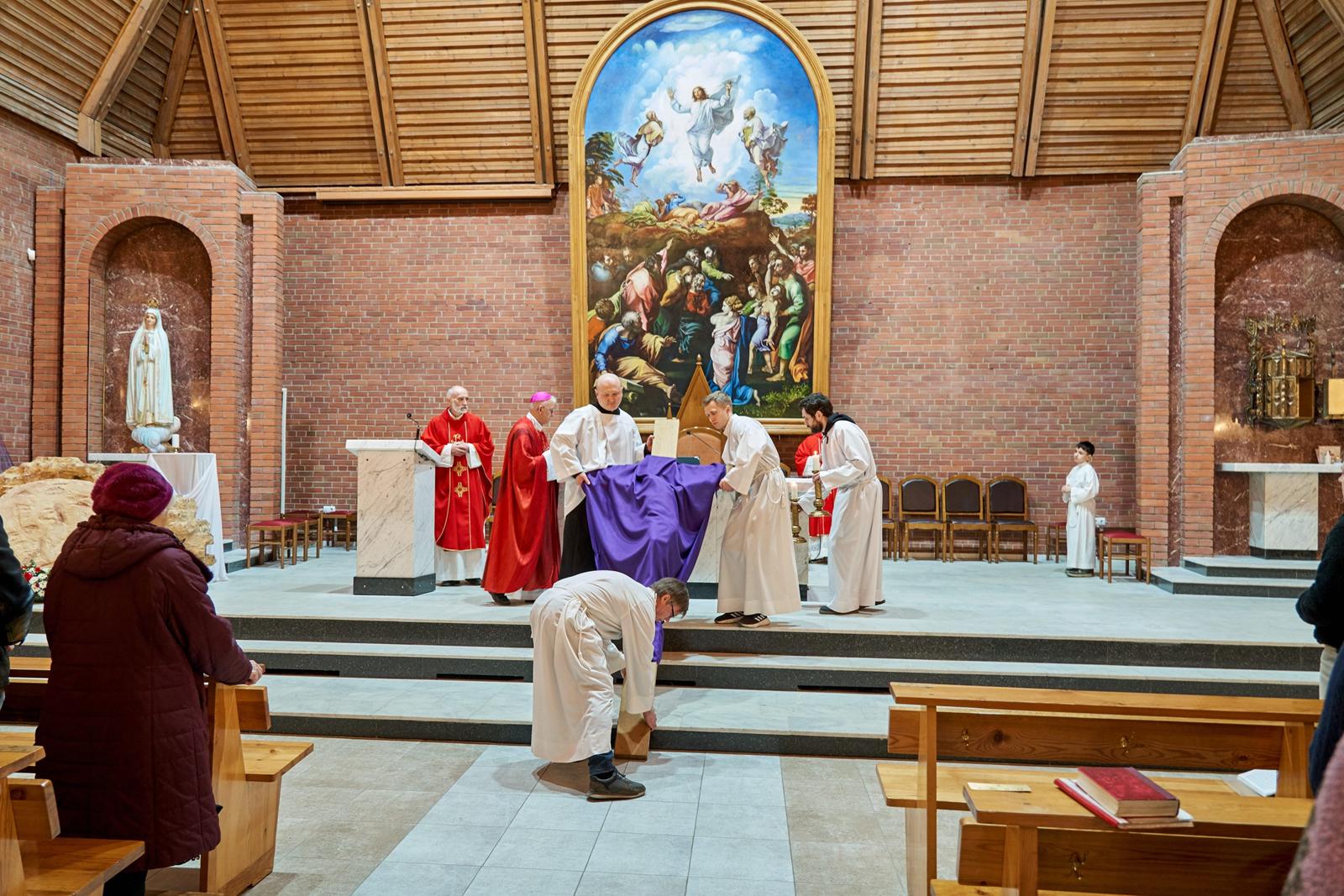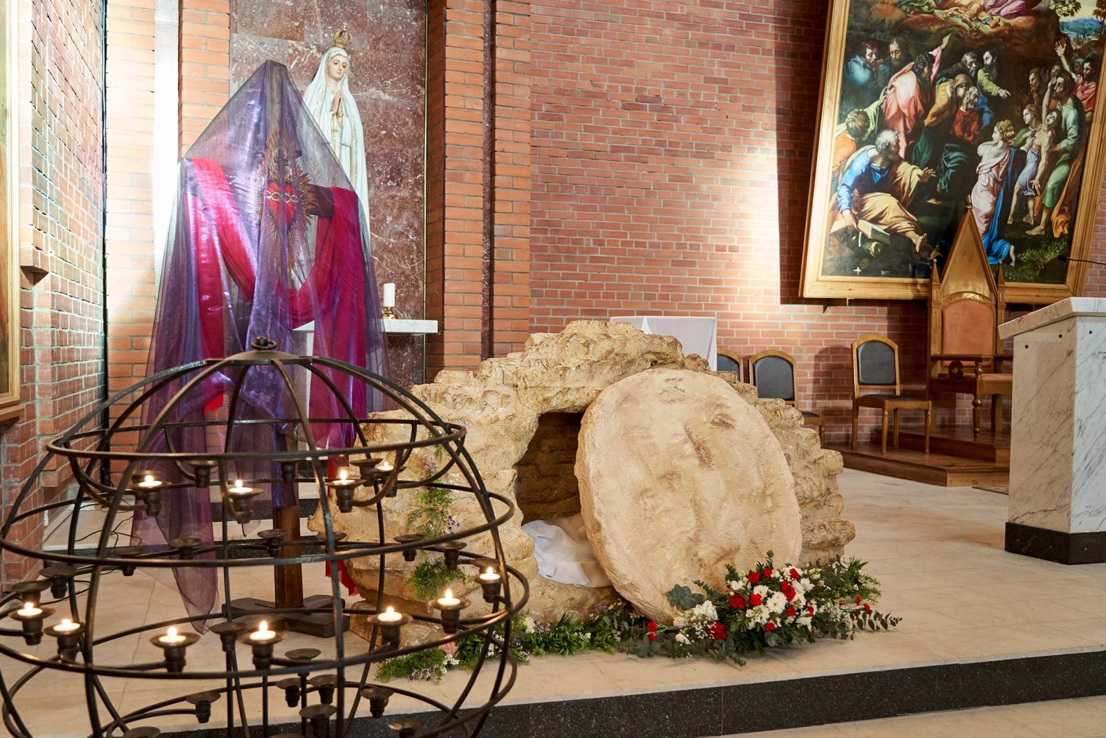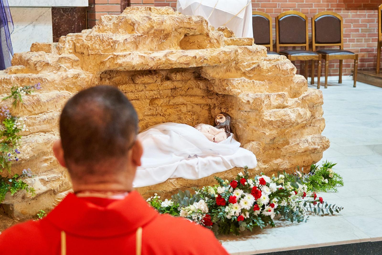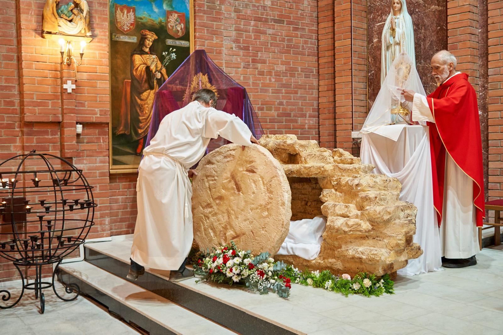 Богослужение завершается открытием макета гробницы Иисуса Христа (аналог используемой в Православной Церкви плащаницы) и водружением вблизи него Святых Даров для поклонения.