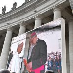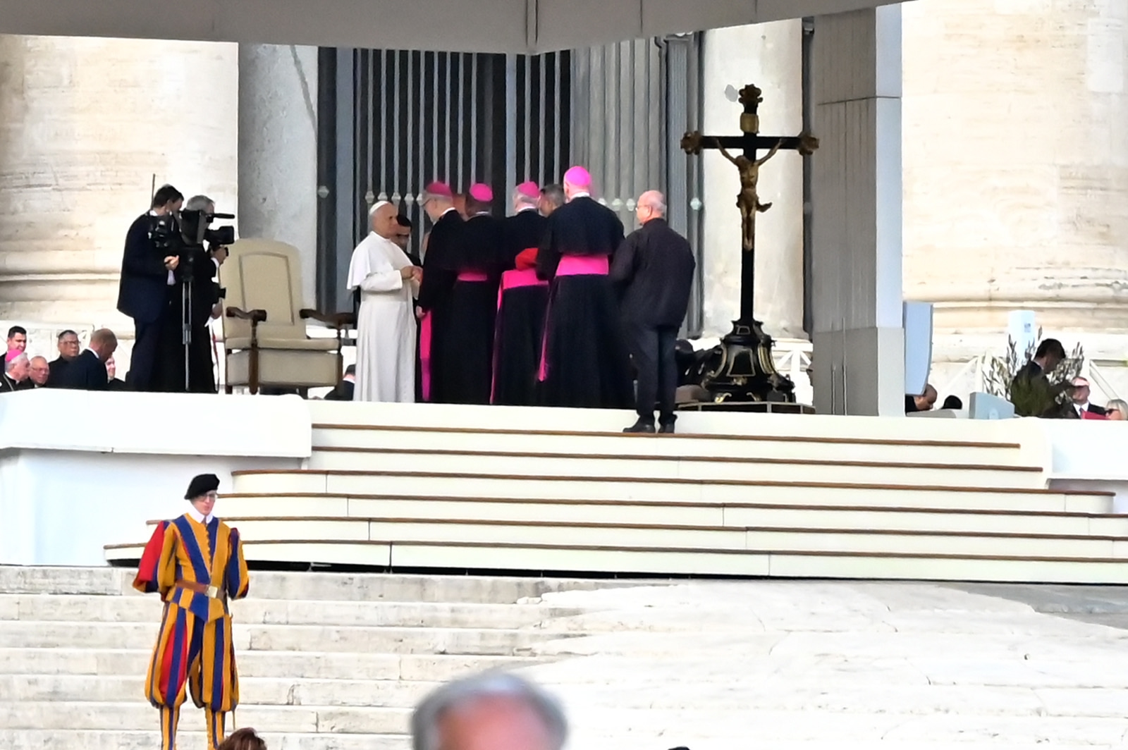 После общей молитвы Понтифик благословил всех присутствующих, а также преподал индивидуальное благословение молодожёнам и больным. После чего присутствующие на аудиенции епископы смогли лично поприветствовать Святейшего Отца, а некоторые преподнесли подарки. Так владыка Клеменс Пиккель, ординарий Саратовской Епархии Святого Климента, подарил Папе книгу Александра Крылова «Mein Lebensentwurf», изданную на немецком языке, в которой автор поделился опытом передачи веры детям и молодежи.